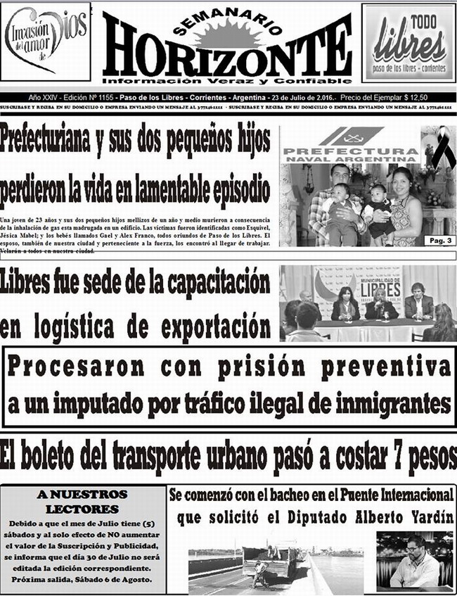 Como todos los fines de semana, adelantamos desde Todo Libres, la portada con los temas destacados del Semanario Horizonte, que ya es entregado a quienes se encuentran suscritos. Policiales, Política, Interés General, Sociales y mucho más. (VER TAPA COMPLETA EN INTERIOR)
