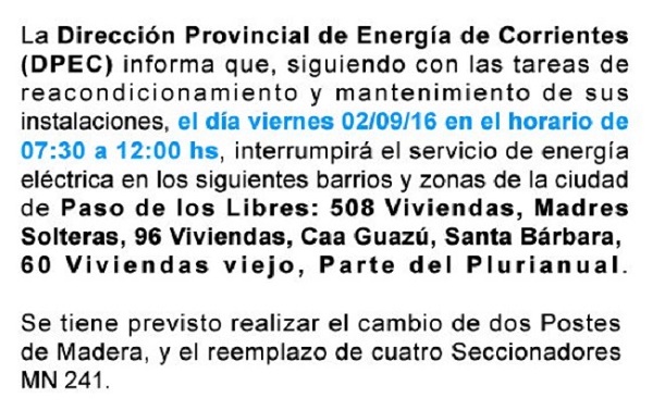 Es por cambio de postes y cableado, remplazo de seccionadores y otras tareas en las que trabaja ahora la cuadrilla de la Dirección Provincial de Energía. Los sectores afectados y que no contarán con el servicio son los siguientes (Ver en interior).