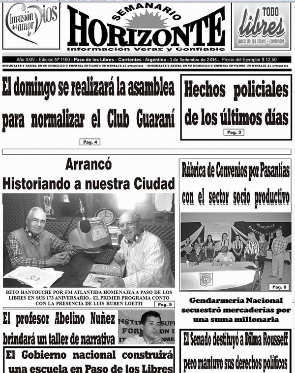 Como todos los fines de semana, adelantamos desde Todo Libres, la portada con los temas destacados del Semanario Horizonte, que ya es entregado a quienes se encuentran suscritos. Policiales, Política, Interés General, Sociales y mucho más. (VER TAPA COMPLETA EN INTERIOR)