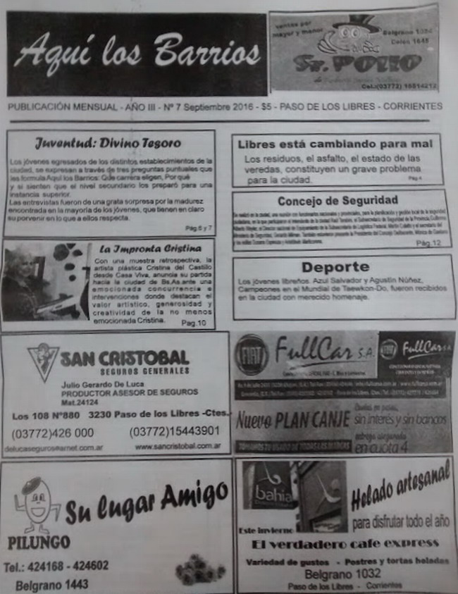 Proponemos a nuestros lectores, los temas que aparecen en la portada impresa de la publicación mensual “Aquí los Barrios”, que aborda diversos temas de interés general. Corresponde al mes de septiembre y presenta temas de juventud, ciudad, sociedad y deportes. Tapa completa en interior