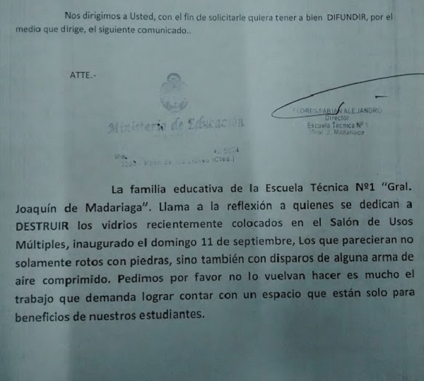 Pocas horas luego de ser inaugurado el salón de usos múltiples de la Escuela de educación Técnica Nº 1, sufrió la rotura de varios de sus vidrios por presuntos vándalos que, con piedras y posibles disparos de arma de de aire comprimido causaron un daño importante a la institución. El Rector de esa casa de estudios habló con LT 12. Audio completo en interior