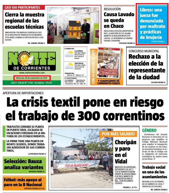 REPERCUSIONES EN PAGINA 12 Y DIARIO NORTE Una jueza fue denunciada por maltrato Pagina 12: Un grupo de empleados del juzgado correntino Civil y Comercial de la ciudad de Paso de los Libres denunció penalmente a la magistrada a cargo del estrado por realizar hostigamientos de diverso tipo y “prácticas esotéricas” dentro del tribunal.  PAGINA 12: Denunciada por esotérica Un grupo de empleados del juzgado correntino Civil y Comercial de la ciudad de Paso de los Libres denunció penalmente a la magistrada a cargo del estrado, Ana de Jesús Gauna de Atencia, por realizar hostigamientos de diverso tipo y “prácticas esotéricas” dentro del tribunal.