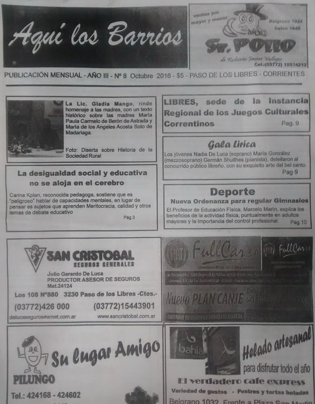 Proponemos a nuestros lectores, los temas que aparecen en la portada impresa de la publicación mensual “Aquí los Barrios”, que aborda diversos temas de interés general. Corresponde al mes de octubre y presenta temas de juventud, ciudad, sociedad y deportes. Tapa completa en interior