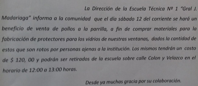 La Escuela Técnica N° 1 realizará una venta de pollos a la parrilla, a fin de comprar materiales para la fabricación de protectores para los vidrios de las ventanas del salón de usos múltiples recientemente inaugurado y que ya sufriera en varias oportunidades, la rotura de los mismos por parte de personas ajenas a la institución.