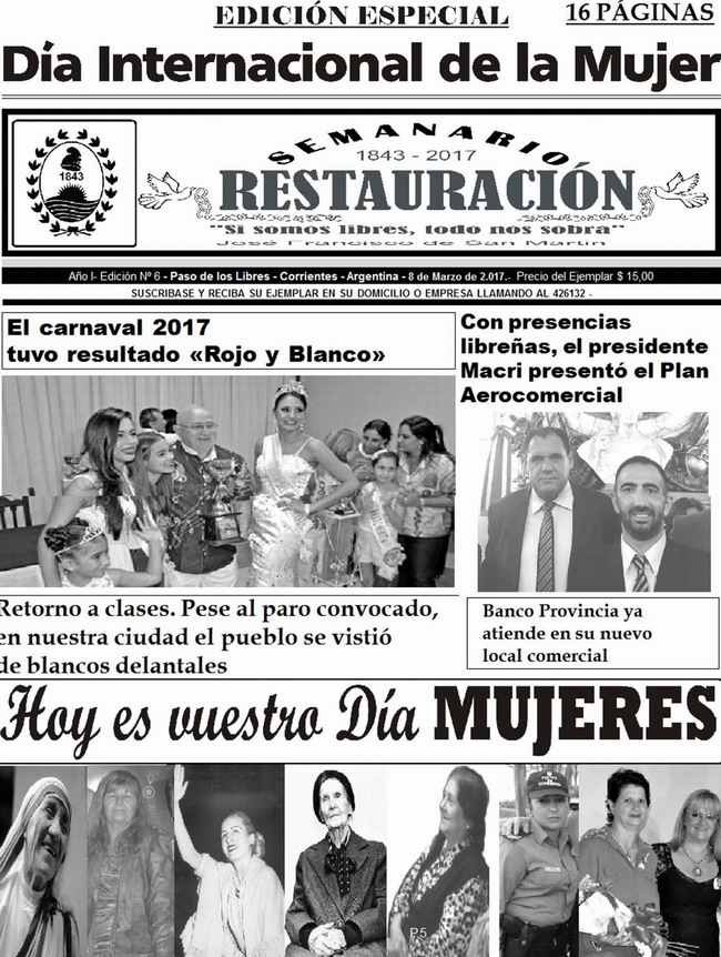 El Semanario Restauración ya se encuentra en las calles. Como cada miércoles, presenta diversos temas de actualidad. Policiales, Sociales, Entrevistas, Políticos, Deportivos y muchos temas más. Ver Tapa Completa en Interior.