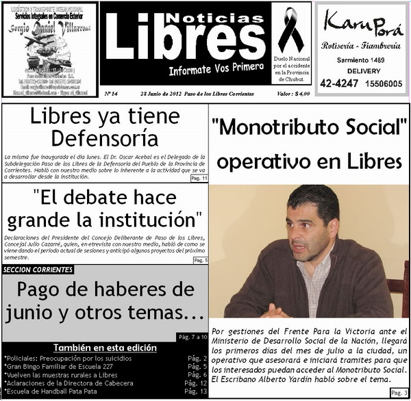 (Martes 3 de Julio) Los temas que incluye esta edición son: Entrevistas a Oscar Acebal, defensor del pueblo en Paso de los Libres. Alberto Yardín y Julio Cazarré, Concejo Deliberante. Mary Bond, directora Escuela Nº 227. Vuelven las muestras rurales a Libres. Policiales. Servicios y más… MIRÁ LA TAPA COMPLETA EN EL INTERIOR