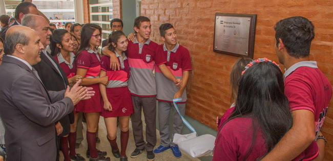 Tras realizar el tradicional corte de cintas y descubrimiento de placa junto a la comunidad educativa presente, Colombi se dirigió a la mesa central, donde encabezó el acto acompañado por el intendente anfitrión, Raúl Tarabini; la ministra de Educación, Susana Benítez; el titular de Coordinación, Eduardo Vischi; el presidente de la Cámara de Diputados, Pedro Cassani; y el rector de la institución, Daniel Fernández.
