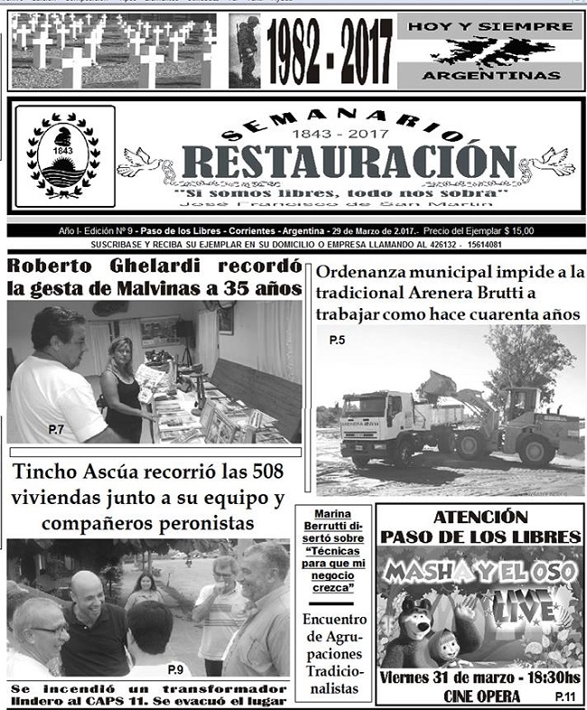 El Semanario Restauración ya se encuentra en las calles. Como cada miércoles, presenta diversos temas de actualidad. Policiales, Sociales, Entrevistas, Políticos, Deportivos y muchos temas más. Ver Tapa Completa en Interior.