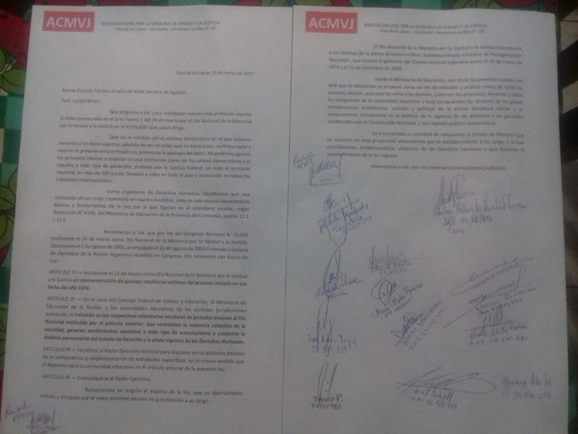 Paso de los Libres, 29 de marzo de 2017 Rector Escuela Amelia del Valle Herrera de Aguirre Prof. Carlos Britez: Nos dirigimos a Ud. para manifestar nuestro más profundo repudio al video proyectado en el acto Forma 1 del 24 de marzo por el Día Nacional de la Memoria por la Verdad y la Justicia en la institución que usted dirige. Que no se condice con el sistema democrático en el que estamos inmersos y las leyes vigentes, además de ser un video que no tiene autor, no firma nadie e incurre en groseros errores históricos, promueve la apología del delito. No podemos ignorar los principios básicos a respetar en una institución como ser los valores democráticos y el repudio a todo tipo de genocidio, probado por la Justicia Federal, en todo el territorio nacional, en más de 500 juicios llevados a cabo en todo el país y reconocido en todos los tribunales internacionales. Como organismo de Derechos Humanos, repudiamos que una institución de tan larga trayectoria en nuestra localidad, viole de ésta manera los principios básicos y fundamentos de la Ley por la que figuran en el calendario escolar, según Resolución N° 6148, del Ministerio de Educación de la Provincia de Corrientes, puntos 12.1 y 12.6. Recordamos a Ud. que por ley del Congreso Nacional N° 25.633 Instituyese el 24 de marzo como Día Nacional de la Memoria por la Verdad y la Justicia. Sancionada el 1 de agosto de 2002, promulgada el 22 de agosto de 2002 El Senado y Cámara de Diputados de la Nación Argentina reunidos en Congreso, etc. sancionan con fuerza de Ley: ARTICULO 1º — Instituyese el 24 de marzo como Día Nacional de la Memoria por la Verdad y la Justicia en conmemoración de quienes resultaron víctimas del proceso iniciado en esa fecha del año 1976. ARTICULO 2º — En el seno del Consejo Federal de Cultura y Educación, el Ministerio de Educación de la Nación y las autoridades educativas de las distintas jurisdicciones acordarán, la inclusión en los respectivos calendarios escolares de jornadas alusivas al Día Nacional instituido por el artículo anterior, que consoliden la memoria colectiva de la sociedad, generen sentimientos opuestos a todo tipo de autoritarismo y auspicien la defensa permanente del Estado de Derecho y la plena vigencia de los Derechos Humanos. ARTICULO 3º — Facúltase al Poder Ejecutivo nacional para disponer en los distintos ámbitos de su competencia la implementación de actividades específicas, en el mismo sentido que el dispuesto para la comunidad educativa en el artículo anterior de la presente ley. ARTICULO 4º — Comuníquese al Poder Ejecutivo. Remarcamos en negrita el espíritu de la ley, que es abiertamente violado y ultrajado por el video anónimo pasado en la institución a su cargo. El Día Nacional de la Memoria por la Verdad y la Justicia conmemora a las víctimas de la última dictadura militar, autodenominada «Proceso de Reorganización Nacional», que usurpó el gobierno del Estado nacional argentino entre el 24 de marzo de 1976 y el 10 de diciembre de 1983. Desde el Ministerio de Educación, son claras las premisas cuando nos dice que la efeméride se propone como un día de reflexión y análisis crítico en todas las escuelas del país, para que los niños y los jóvenes, junto con los directivos, docentes y todos los integrantes de la comunidad educativa y local comprendan los alcances de las graves consecuencias económicas, sociales y políticas de la última dictadura militar y se comprometan activamente en la defensa de la vigencia de los derechos y las garantías establecidos por la Constitución Nacional, y del régimen político democrático. Es innumerable la cantidad de violaciones al Estado de Derecho que se cometen en ésta proyección seleccionada por el establecimiento a su cargo, a la que consideramos antidemocrática, violatoria de los Derechos humanos y que fomenta el incumplimiento de la ley vigente. Informamos a Ud. que nos reservamos actuaciones judiciales.