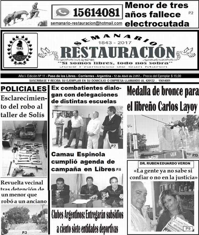 El Semanario Restauración ya se encuentra en las calles. Como cada miércoles, presenta diversos temas de actualidad. Policiales, Sociales, Entrevistas, Políticos, Deportivos y muchos temas más. Ver Tapa Completa en Interior.