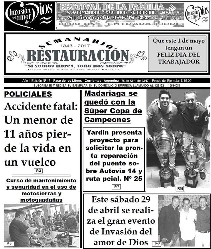 El Semanario Restauración ya se encuentra en las calles. Como cada miércoles, presenta diversos temas de actualidad. Policiales, Sociales, Entrevistas, Políticos, Deportivos y muchos temas más. Ver Tapa Completa en Interior.