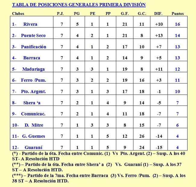 Tras los encuentros disputados el pasado fin de semana, enviamos los resultados y tablas actualizadas de las distintas divisiones. Cabe señalar que el encuentro entre Barraca y Ferro/Pumitas fue suspendido a los 38 minutos del segundo tiempo y dicho encuentro pasa a resolución del Tribunal de Disciplina, al igual que los suspendidos en la fecha anterior.