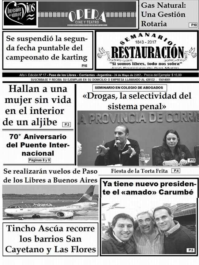 El Semanario Restauración ya se encuentra en las calles. Como cada miércoles, presenta diversos temas de actualidad. Policiales, Sociales, Entrevistas, Políticos, Deportivos y muchos temas más. Ver Tapa Completa en Interior.