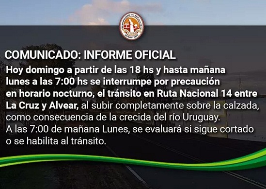 Así lo ha informado el municipio de La Cruz, a consecuencia de la crecida del Río Uruguay y además comunicaron que a las 7 horas del lunes se reunirán nuevamente para evaluar la continuidad del corte de tránsito.