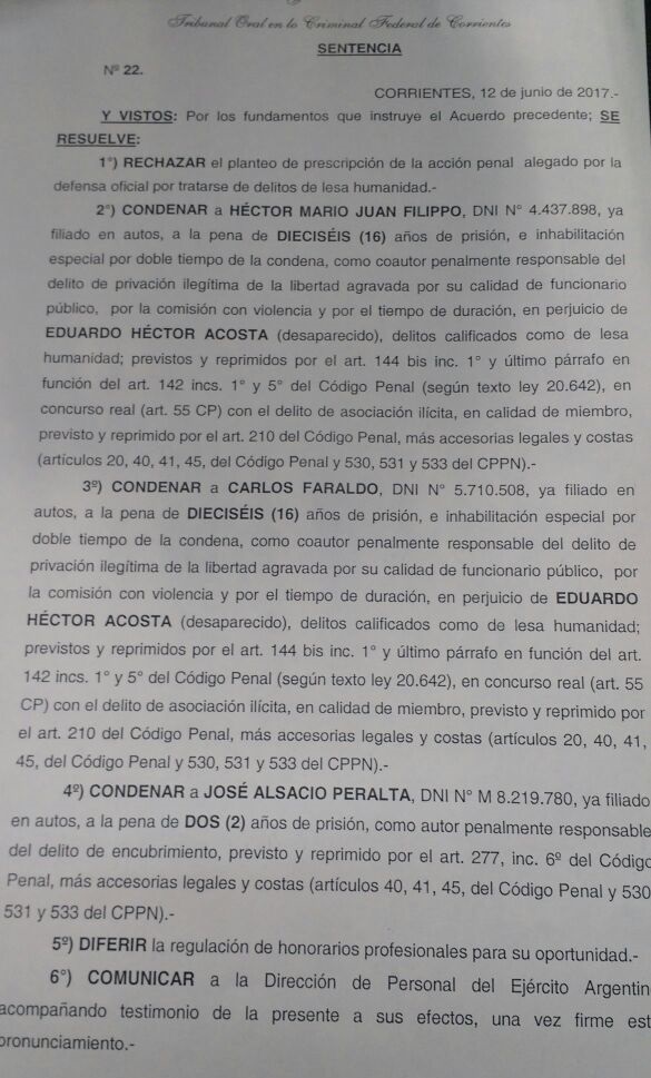 OCTAVO JUICIO POR CRÍMENES DE LESA HUMANIDAD EN CORRIENTES Condenaron a los acusados de la desaparición del estudiante Pata Acosta El Tribunal Oral Federal de Corrientes condenó esta mañana a los responsables de la desaparición del joven correntino víctima del terrorismo de estado de 1976. De la lectura de la sentencia participaron familiares de Pata Acosta y militantes de derechos humanos de Paso de los Libres, Goya y Corrientes.  El octavo juicio por crímenes de lesa humanidad en Corrientes terminó ayer con la sentencia a 16 años de prisión para Carlos Faraldo, quien se desempeñaba como agente de inteligencia del Ejército y Héctor Filippo, ex oficial del Destacamento de Inteligencia 123 del Ejército, ambos condenados por la privación ilegítima de la libertad a Héctor “Pata” Acosta (desaparecido el 22 de marzo de 1976 por la dictadura cívico militar).