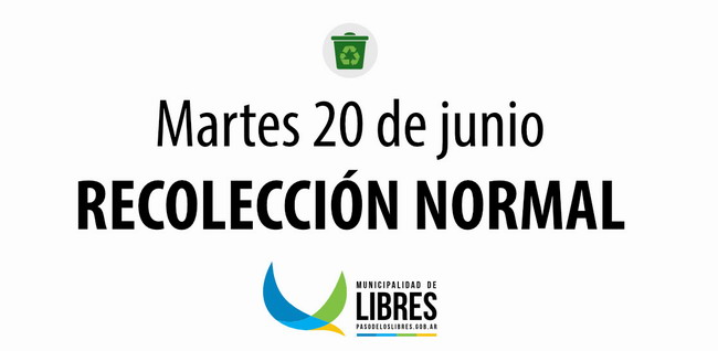 La Dirección de Servicios Públicos de la Municipalidad de Paso de los Libres informa a la comunidad que hoy, 20 de junio, feriado por el Día de la Bandera, se realizará normalmente el servicio de recolección de residuos domiciliarios y patológicos.