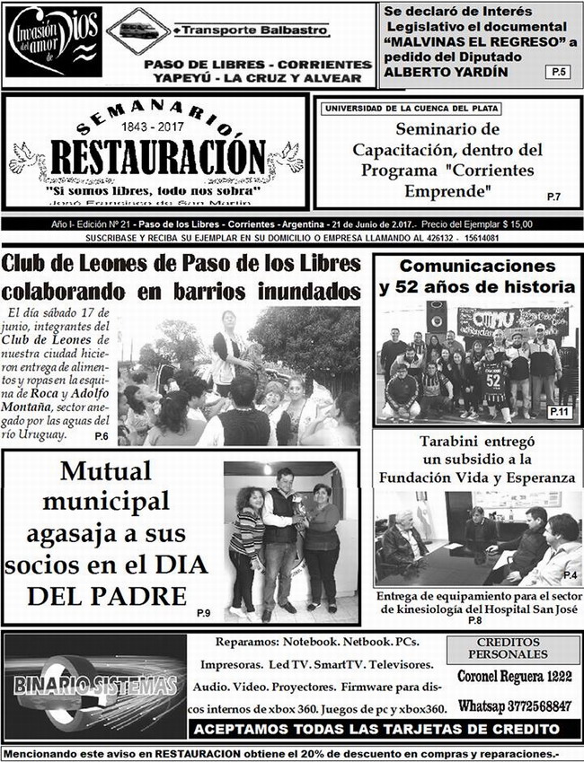 El Semanario Restauración ya se encuentra en las calles. Como cada miércoles, presenta diversos temas de actualidad. Policiales, Sociales, Entrevistas, Políticos, Deportivos y muchos temas más. Ver Tapa Completa en Interior.