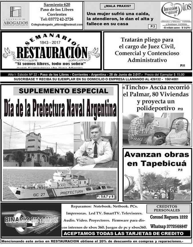 El Semanario Restauración ya se encuentra en las calles. Como cada miércoles, presenta diversos temas de actualidad. Policiales, Sociales, Entrevistas, Políticos, Deportivos y muchos temas más. Ver Tapa Completa en Interior.