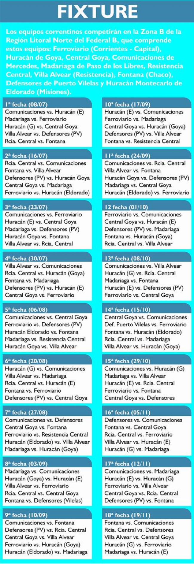 Se dio a conocer ayer el fixture del torneo Federal B que organiza el Consejo Federal de Fútbol. En representación de nuestra provincia participarán Comunicaciones de Mercedes, Huracán de Goya, Madariaga de Paso de los Libres, Central Goya y Ferroviario de Capital.
