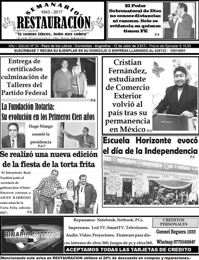 El Semanario Restauración ya se encuentra en las calles. Como cada miércoles, presenta diversos temas de actualidad. Policiales, Sociales, Entrevistas, Políticos, Deportivos y muchos temas más. Ver Tapa Completa en Interior.