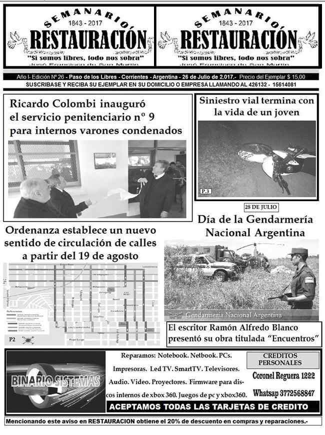 El Semanario Restauración ya se encuentra en las calles. Como cada miércoles, presenta diversos temas de actualidad. Policiales, Sociales, Entrevistas, Políticos, Deportivos y muchos temas más. Ver Tapa Completa en Interior.