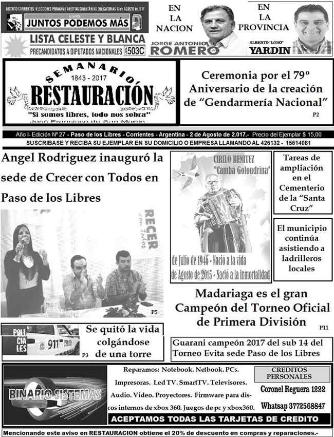 El Semanario Restauración ya se encuentra en las calles. Como cada miércoles, presenta diversos temas de actualidad. Policiales, Sociales, Entrevistas, Políticos, Deportivos y muchos temas más. Ver Tapa Completa en Interior.