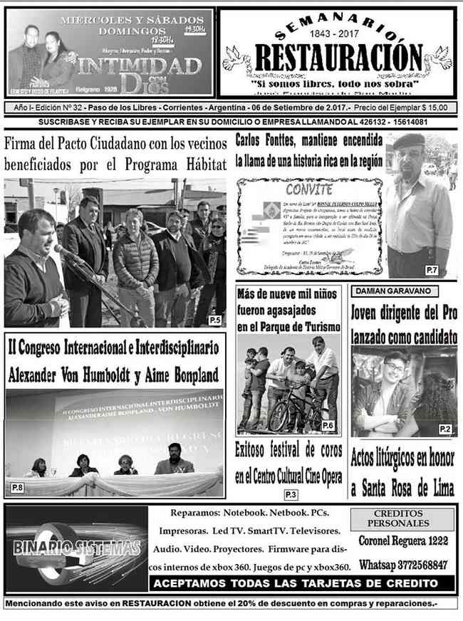El Semanario Restauración ya se encuentra en las calles. Como cada miércoles, presenta diversos temas de actualidad. Policiales, Sociales, Entrevistas, Politicos, Deportivos y muchos temas más. Ver Tapa Completa en Interior.
