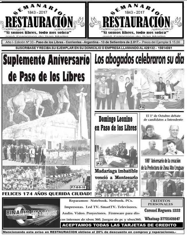 El Semanario Restauración ya se encuentra en las calles. Como cada semana, presenta diversos temas de actualidad. Policiales, Sociales, Entrevistas, Politicos, Deportivos y muchos temas más. Ver Tapa Completa en Interior.