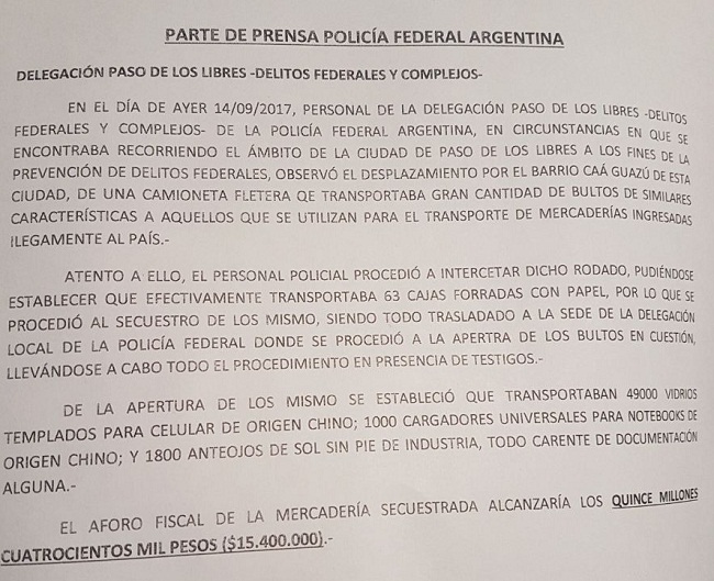 Policía Federal secuestró mercadería por un valor de quince millones de pesos