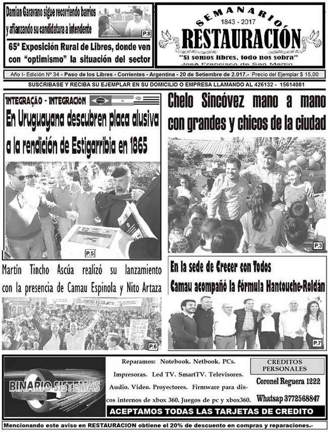 El Semanario Restauración ya se encuentra en las calles. Como cada semana, presenta diversos temas de actualidad. Policiales, Sociales, Entrevistas, Politicos, Deportivos y muchos temas más. Ver la Tapa Completa en Interior.