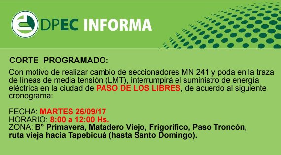 Así lo hicieron saber desde la Dirección de Energía de la Provincia de Corrientes. Será de 8 a 12 horas en distintos sectores de la ciudad para realizar cambios de seccionadores, lo que motiva la interrupción del servicio de energía para garantizar el trabajo y la seguridad de los operarios. Zonas afectadas