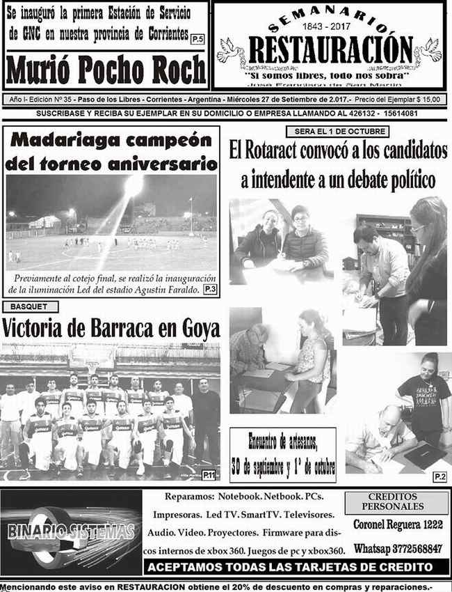 El Semanario Restauración ya se encuentra en las calles. Como cada semana, presenta diversos temas de actualidad. Policiales, Sociales, Entrevistas, Politicos, Deportivos y muchos temas más. Ver la Tapa Completa en Interior.
