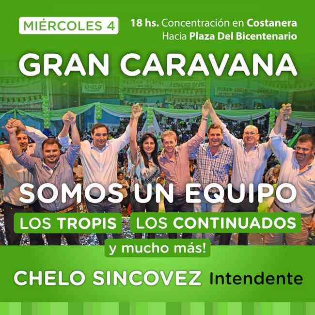 A las 18 horas será la concentración para la caravana del frente Eco+Cambiemos que leva como candidato a intendente a José “Chelo” Sincovez, acompañado de Raúl Tarabini como Vice. Culminará en la plaza del Bicentenario, donde seguramente hablaran a los presentes y posteriormente se realizará un espectáculo musical.