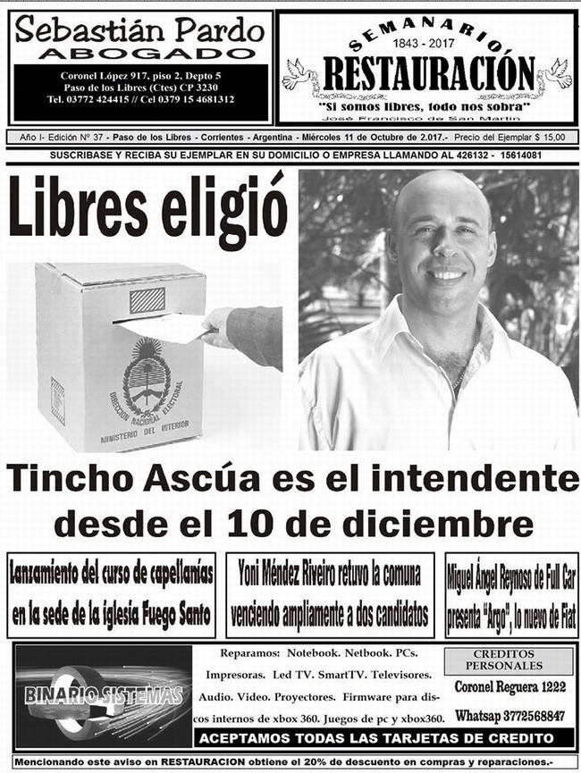 El Semanario Restauración ya se encuentra en las calles. Como cada semana, presenta diversos temas de actualidad. Policiales, Sociales, Entrevistas, Políticos, Deportivos y muchos temas más. Ver la Tapa Completa en Interior.