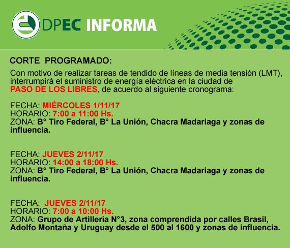La Dirección de Energía de la Provincia de Corrientes informó que, con motivo de realizar tareas de tendido en líneas de media tensión, interrumpirá el suministro de energía eléctrica en la ciudad de Paso de los Libres en los siguientes días y horarios (Ver en interior).