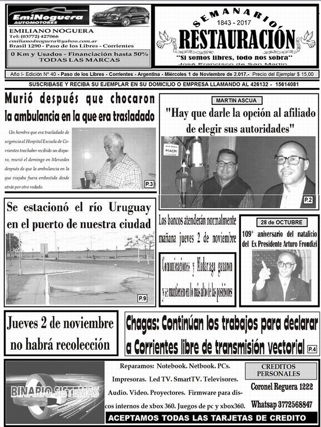 El Semanario Restauración ya se encuentra en las calles. Como cada semana, presenta diversos temas de actualidad. Policiales, Sociales, Entrevistas, Políticos, Deportivos y muchos temas más. Ver la Tapa Completa en Interior.
