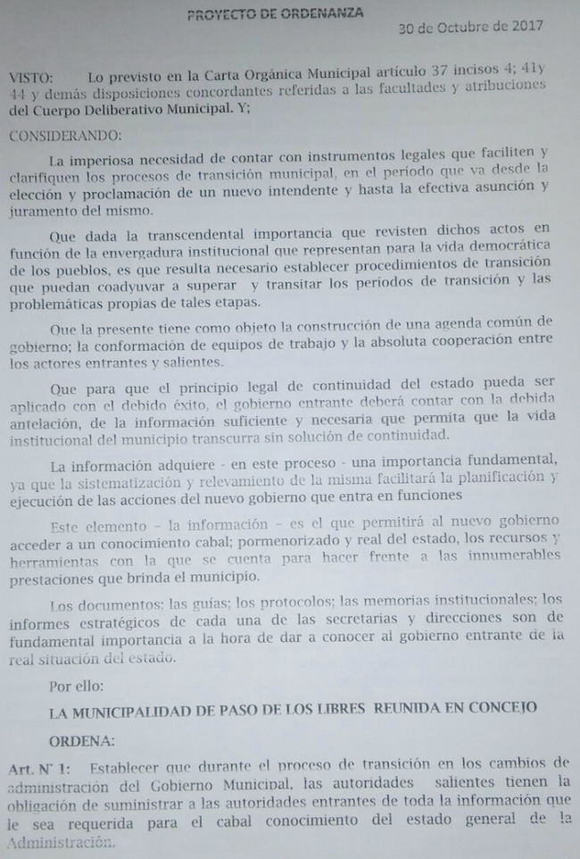 ULTIMA SESIÓN ORDINARIA Proyecto para regular las transiciones no fue tratado en el recinto legislativo El bloque del PJ de Paso de los Libres presentó un proyecto de ordenanza para regular las transiciones municipales. Y si bien el tema fue parte del orden del día de la sesión del pasado martes, “no fue sometido a votación y como ese día ya terminó el período ordinario del Concejo, ya es muy difícil que se trate el tema este año”, expresó el Intendente electo de Paso de los Libres