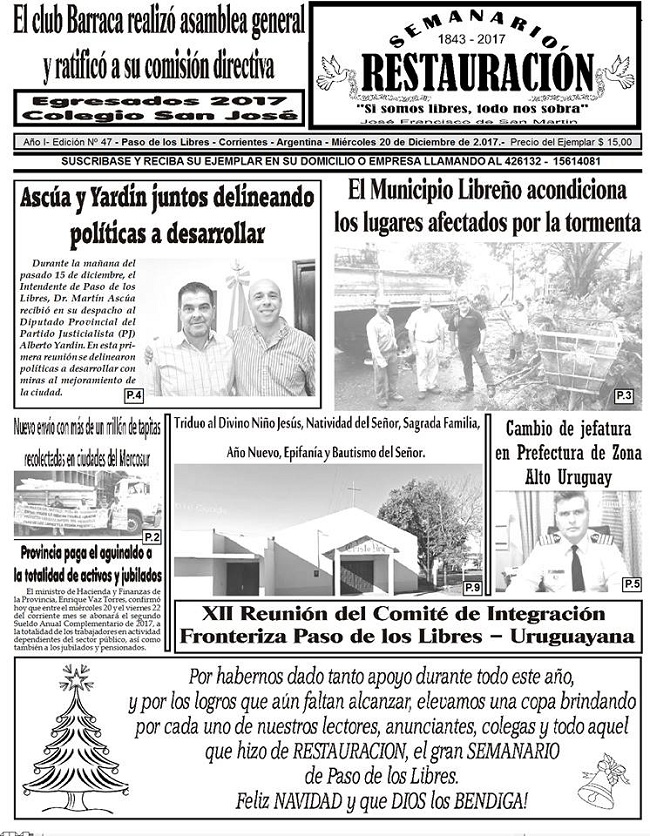 El Semanario Restauración ya se encuentra en las calles. Como cada semana, presenta diversos temas de actualidad. Policiales, Sociales, Entrevistas, Políticos, Deportivos y muchos temas más. Ver la Tapa Completa en Interior.
