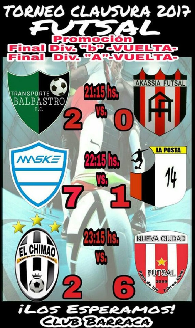 Este viernes se definen los campeones de ambas categorías. Después de un año muy especial se cierra el 2017 con dos finales y una promoción que decidirá que equipos conformarán la División A del futsal libreño el año que viene.