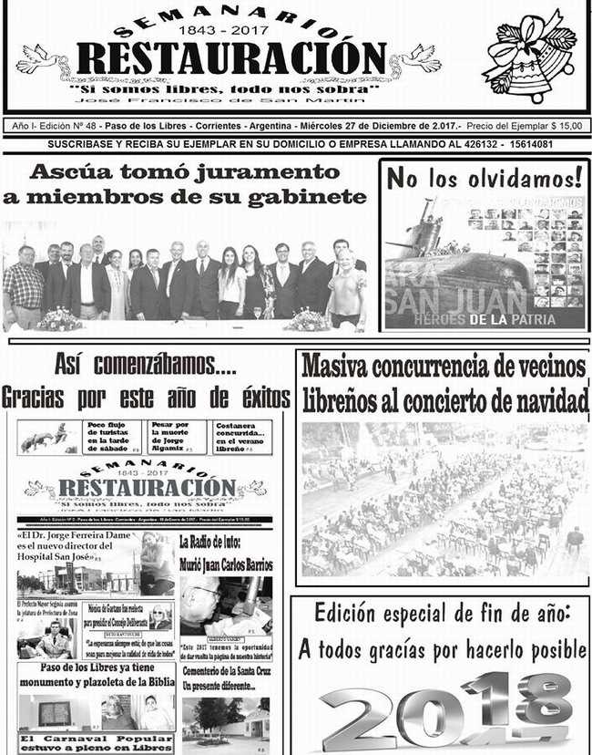 El Semanario Restauración ya se encuentra en las calles. Como cada semana, presenta diversos temas de actualidad. Policiales, Sociales, Entrevistas, Políticos, Deportivos y muchos temas más. Ver la Tapa Completa en Interior.