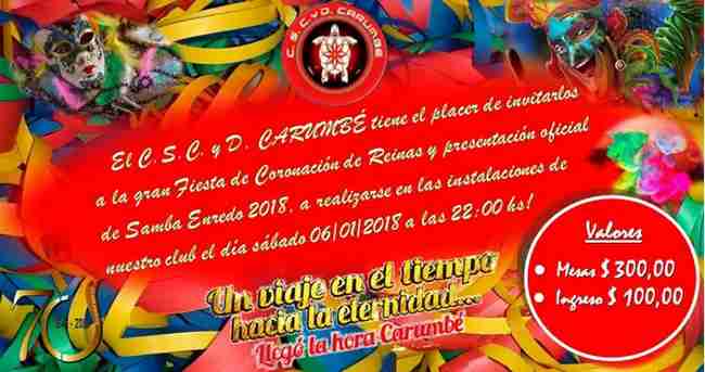 Este sábado, 6 de enero, el Circulo Social, Cultural y Deportivo Carumbé, realizará la gran fiesta en la que coronará a sus soberanas y además presentará su samba enredo de manera oficial, junto al grupo de armonía y la batería que dirige por último año Julian Maiarello.