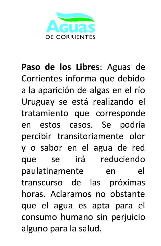 RAMÓN SANTA CRUZ “El sabor del agua irá desapareciendo durante el transcurso del día” Respecto a uno de los temas que se encuentra en la preocupación de la comunidad, el Gerente de Laboratorio de la empresa Aguas de Corrientes, realizó declaraciones donde aseguró que el olor o sabor del agua no genera ningún tipo de daño a la salud y que va a ir desapareciendo durante el transcurso del día.  Lo hizo en declaraciones a LT12, donde especificó que “el río Uruguay tuvo una bajante bastante pronunciada, pero esta vez respecto de otras fue mayor e hizo que las altas temperaturas, la claridad del sol genere la floración de algas por los nutrientes”.