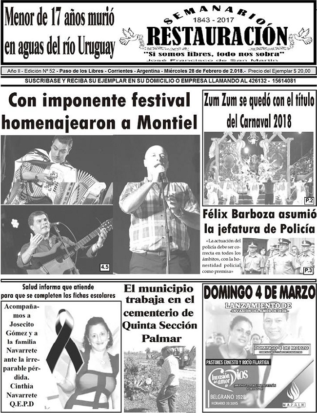 El Semanario Restauración ya se encuentra en las calles. Como cada semana, presenta diversos temas de actualidad. Policiales, Sociales, Entrevistas, Políticos, Deportivos y muchos temas más. Ver la Tapa Completa en Interior.