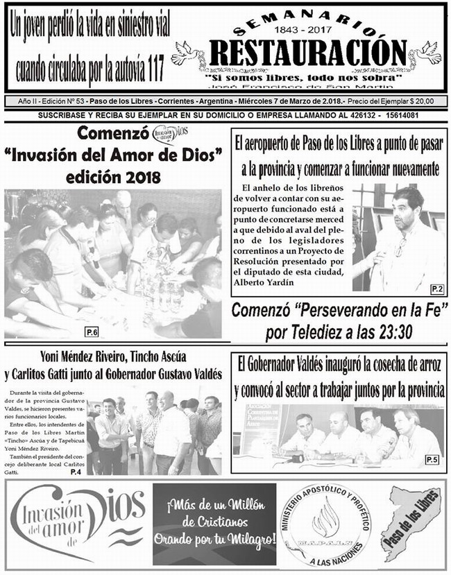 El Semanario Restauración ya se encuentra en las calles. Como cada semana, presenta diversos temas de actualidad. Policiales, Sociales, Entrevistas, Políticos, Deportivos y muchos temas más. Ver la Tapa Completa en Interior.