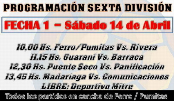 Este sábado desde las 13.30 horas, comienza a disputarse la tercera fecha del torneo de primera división. El martes se realizó el sorteo de horarios y además se definieron los encuentros de sexta división que se juegan también el sábado en la cancha de Ferrocarril/Los Pumitas.