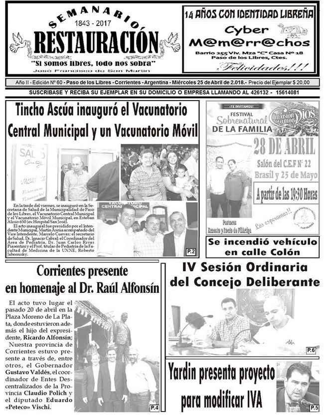El Semanario Restauración ya se encuentra en las calles. Como cada semana, presenta diversos temas de actualidad. Policiales, Sociales, Entrevistas, Políticos, Deportivos y muchos temas más. Ver la Tapa Completa en Interior.