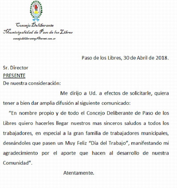 “En nombre propio y de todo el Concejo Deliberante de Paso de los Libres quiero hacerles llegar nuestros mas sinceros saludos a todos los trabajadores, en especial a la gran familia de trabajadores municipales, deseándoles que pasen un Muy Feliz “Día del Trabajo”, manifestando mi agradecimiento por el aporte que hacen al desarrollo de nuestra Comunidad”.