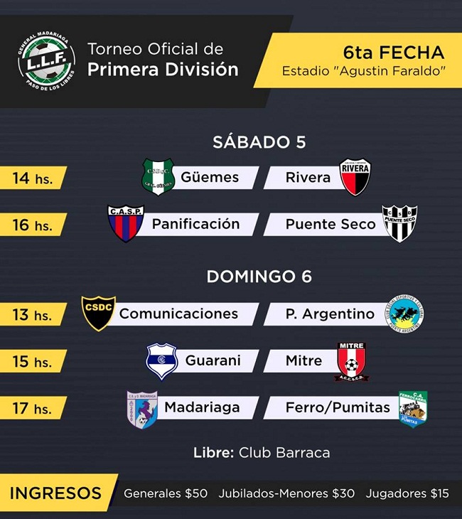 Debido a la cantidad de agua reinante en el campo de juego del estadio de Ferro/Pumitas, se decidió suspender los encuentros de sexta división. De esta manera, durante el fin de semana, solo se disputarán los encuentros de primera división en el Estadio Agustín Faraldo.
