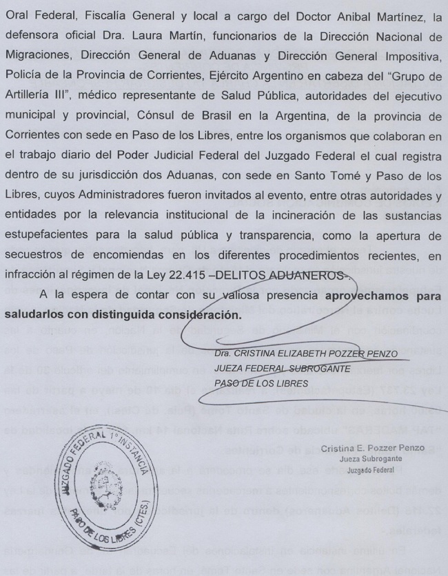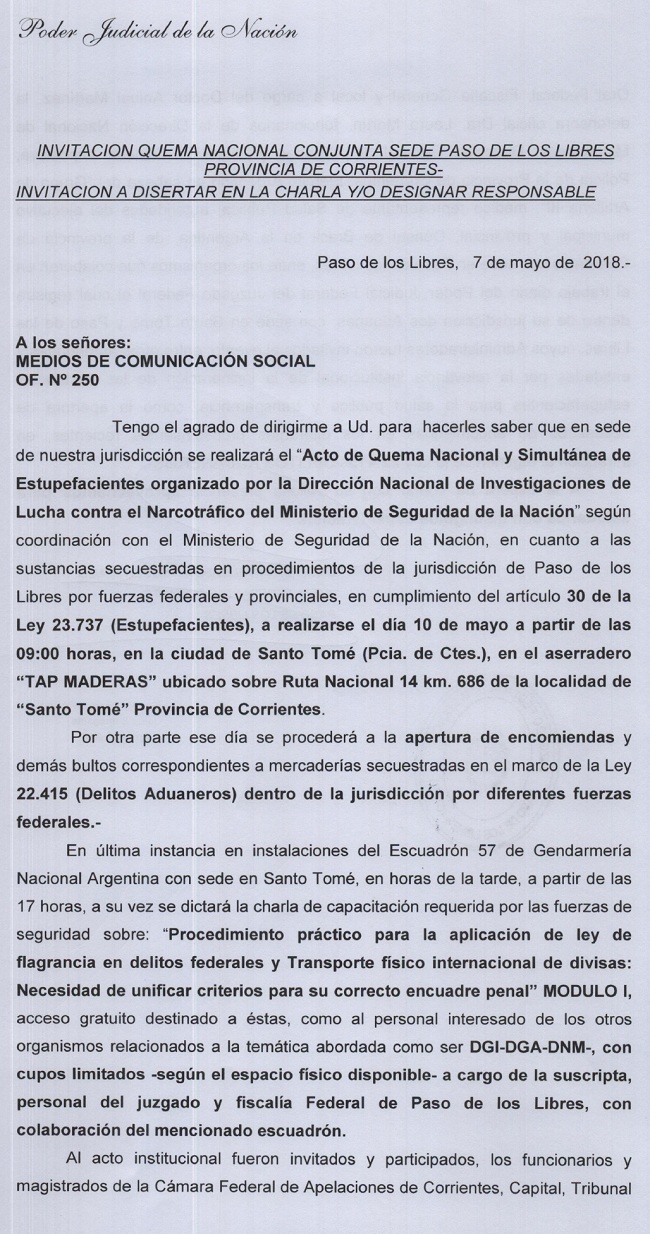 Este jueves, se llevará adelante el “Acto de Quema Nacional y Simultánea de Estupefacientes” organizado por la Dirección Nacional de Investigaciones de Lucha contra el Narcotráfico del Ministerio de Seguridad de la Nación, a partir de las 09:00, en la ciudad de Santo Tome, en el aserradero "TAP MADERAS".