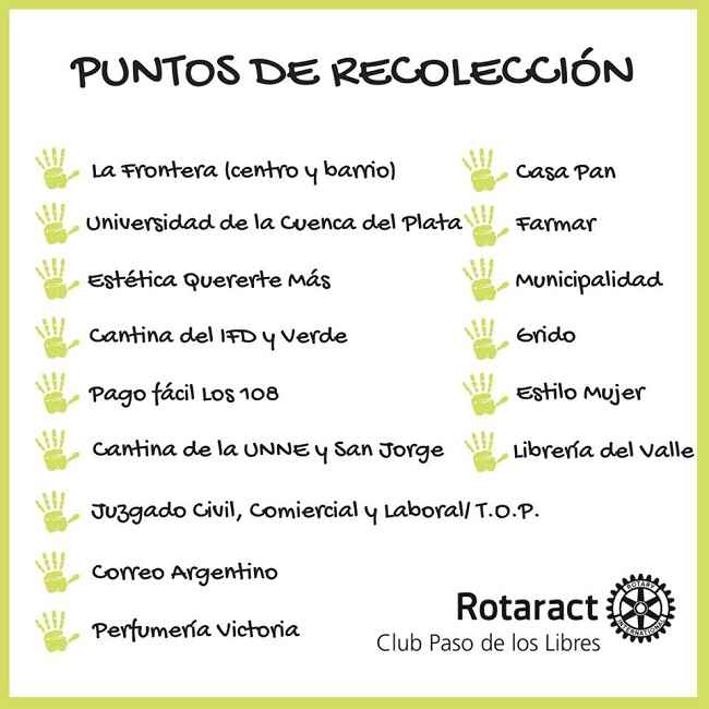En cada punto de recolección hay una cajita de Rotaract para que deposites tus billetes. Tenés tiempo hasta el 30 de mayo, indica la publicación en las redes que señala a los siguientes puntos: